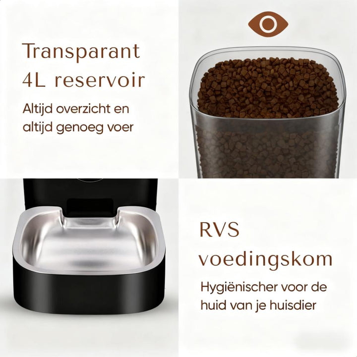 Using the available app for iOS and Android, you can quickly and easily set up personalized feeding programs. With up to 8 meals per day (each consisting of 1 to 20 portions), you can feed your four-legged friend whenever you like, even when you're not at home. You can also give an extra portion via the app or the feed button on the device.