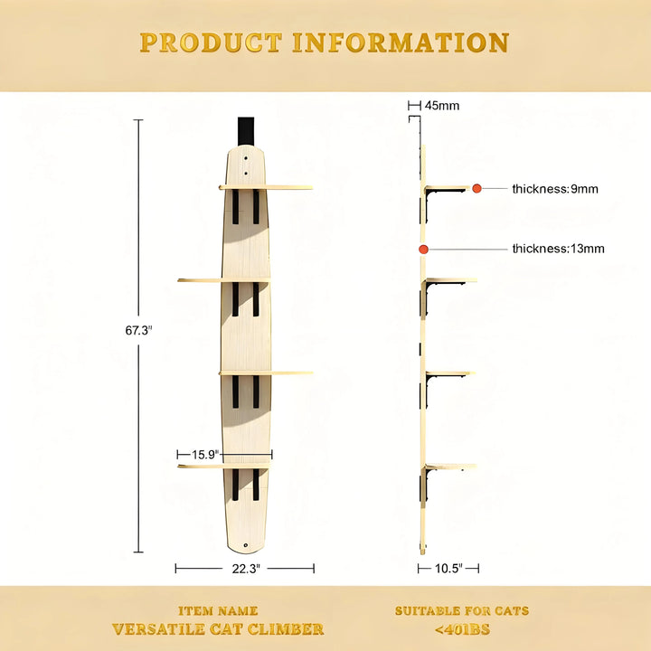 Crafted from sturdy materials, this cat tower supports up to 15 lbs per platform. Overall dimensions: 65″ H x 26.8″ L x 13.8″ W. For safe installation, please ensure your door has a gap wider than 3mm and is 40–45mm thick.